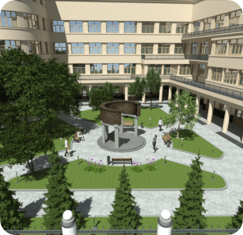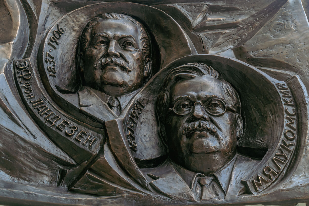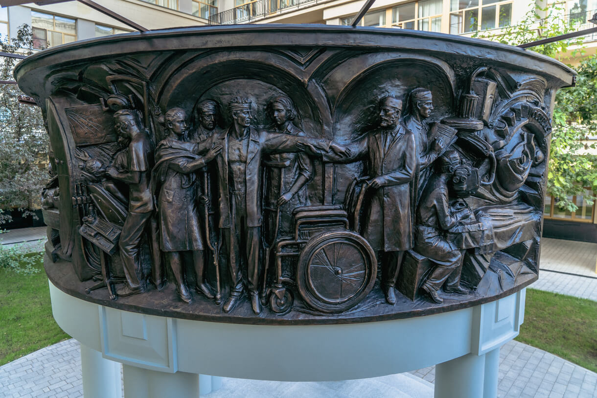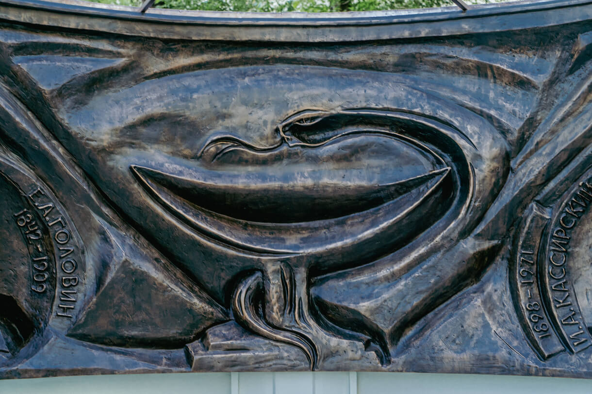 По внутреннему контуру расположены портреты значимых фигур медицины РЖД.