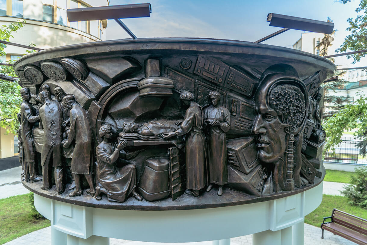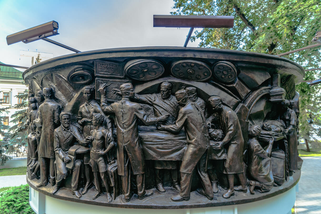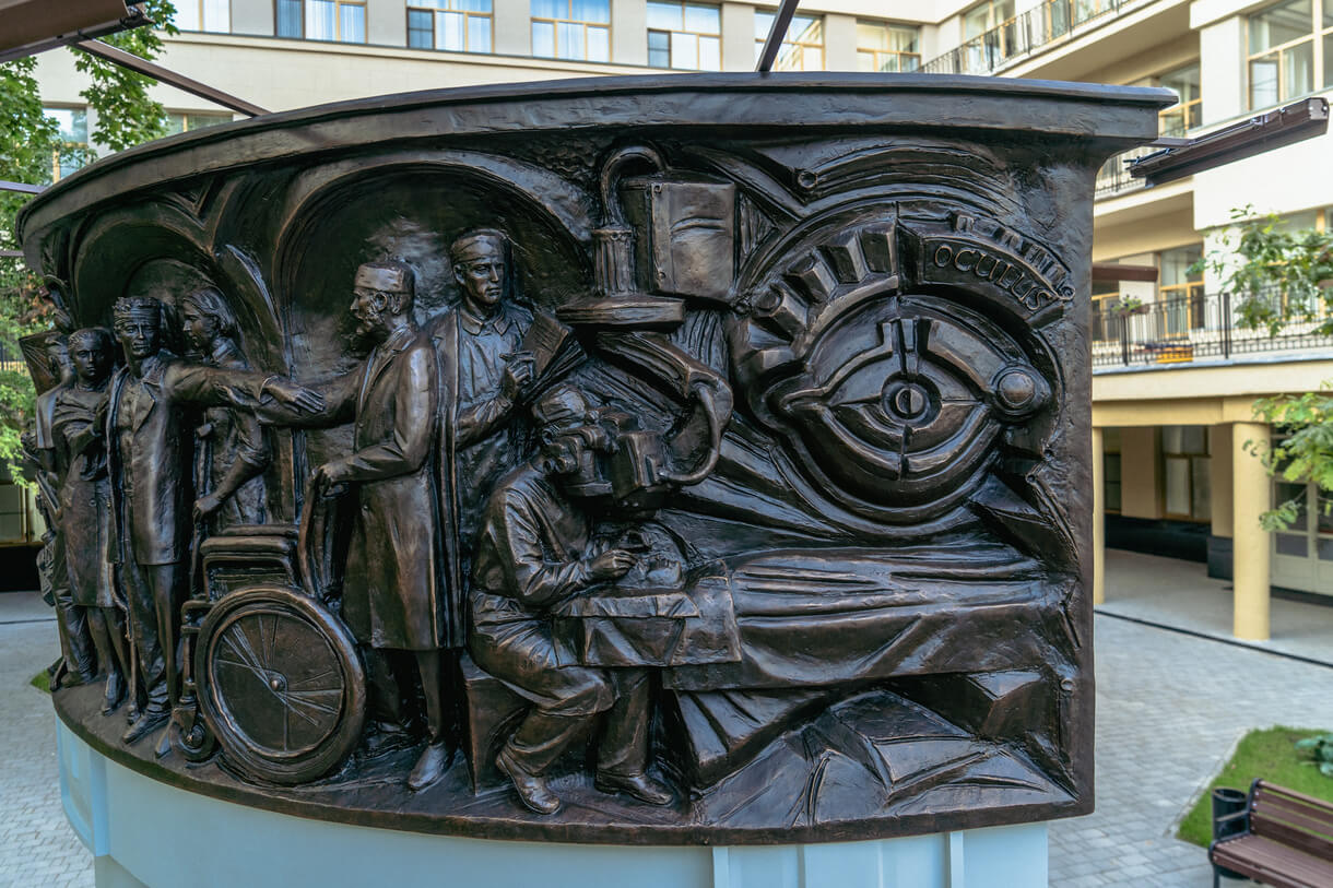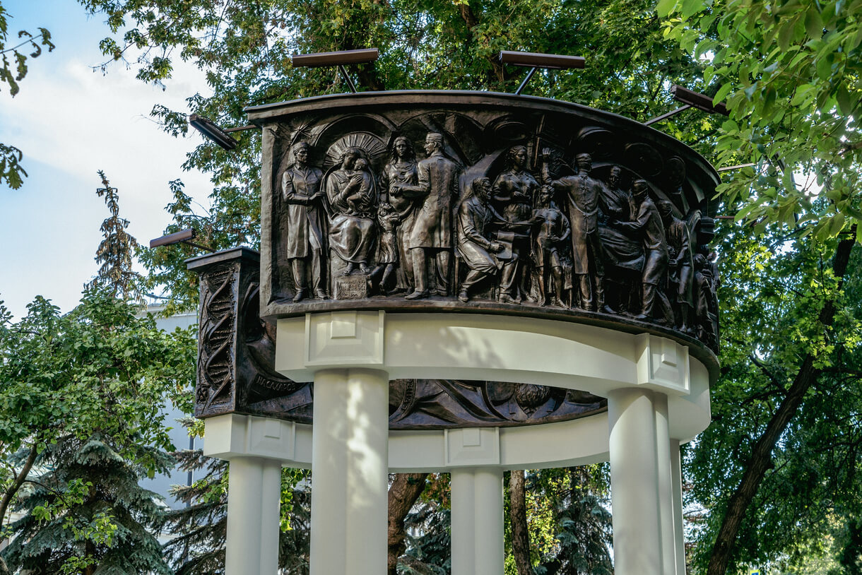 Памятник представляет разомкнутую беседку с бронзовым шлейфом на сдвоенных столбах. Такая форма продиктована внешним обликом Центральной поликлиники и перекликается с ее элементами. По внешнему контуру бронзового шлейфа располагаются повествовательные рельефы с изображением врачебных специальностей - хирургия, терапия, офтальмология, стоматология, травматология, кардиология, педиатрия.