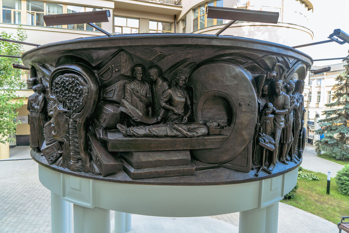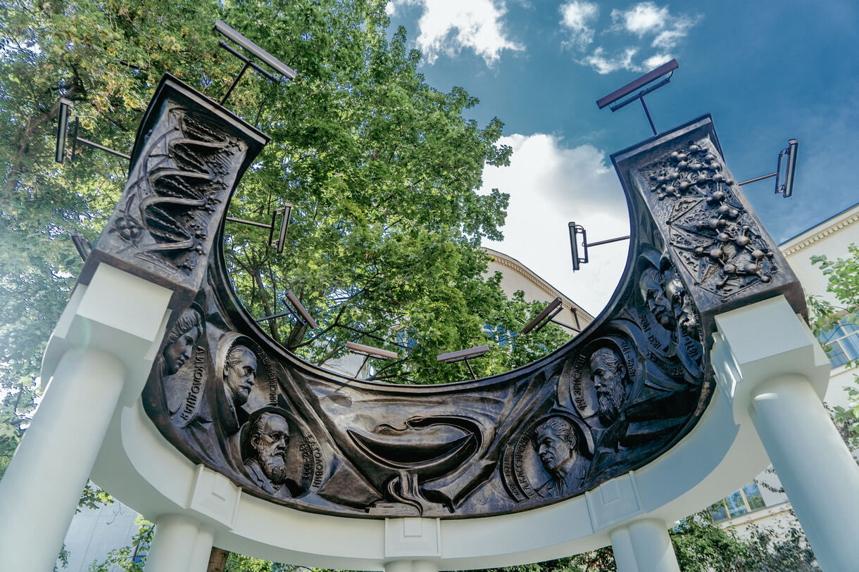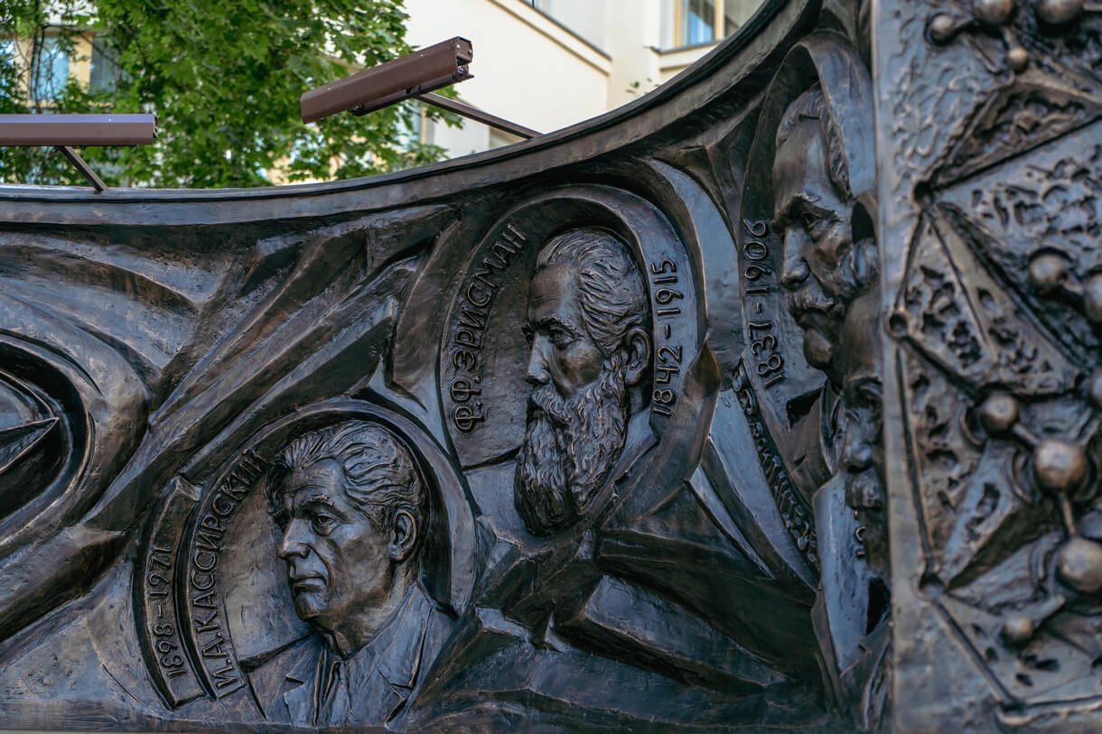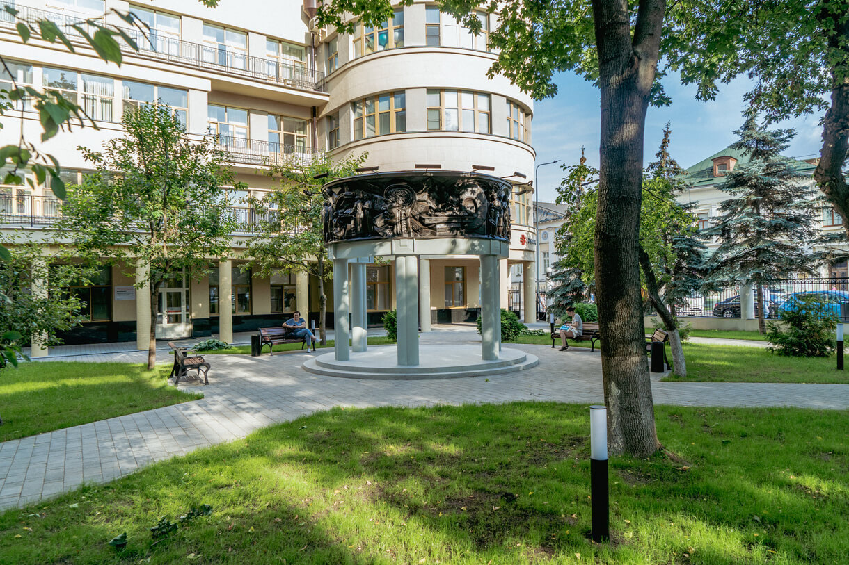 Памятник представляет разомкнутую беседку с бронзовым шлейфом на сдвоенных столбах. Такая форма продиктована внешним обликом Центральной поликлиники и перекликается с ее элементами. По внешнему контуру бронзового шлейфа располагаются повествовательные рельефы с изображением врачебных специальностей - хирургия, терапия, офтальмология, стоматология, травматология, кардиология, педиатрия.